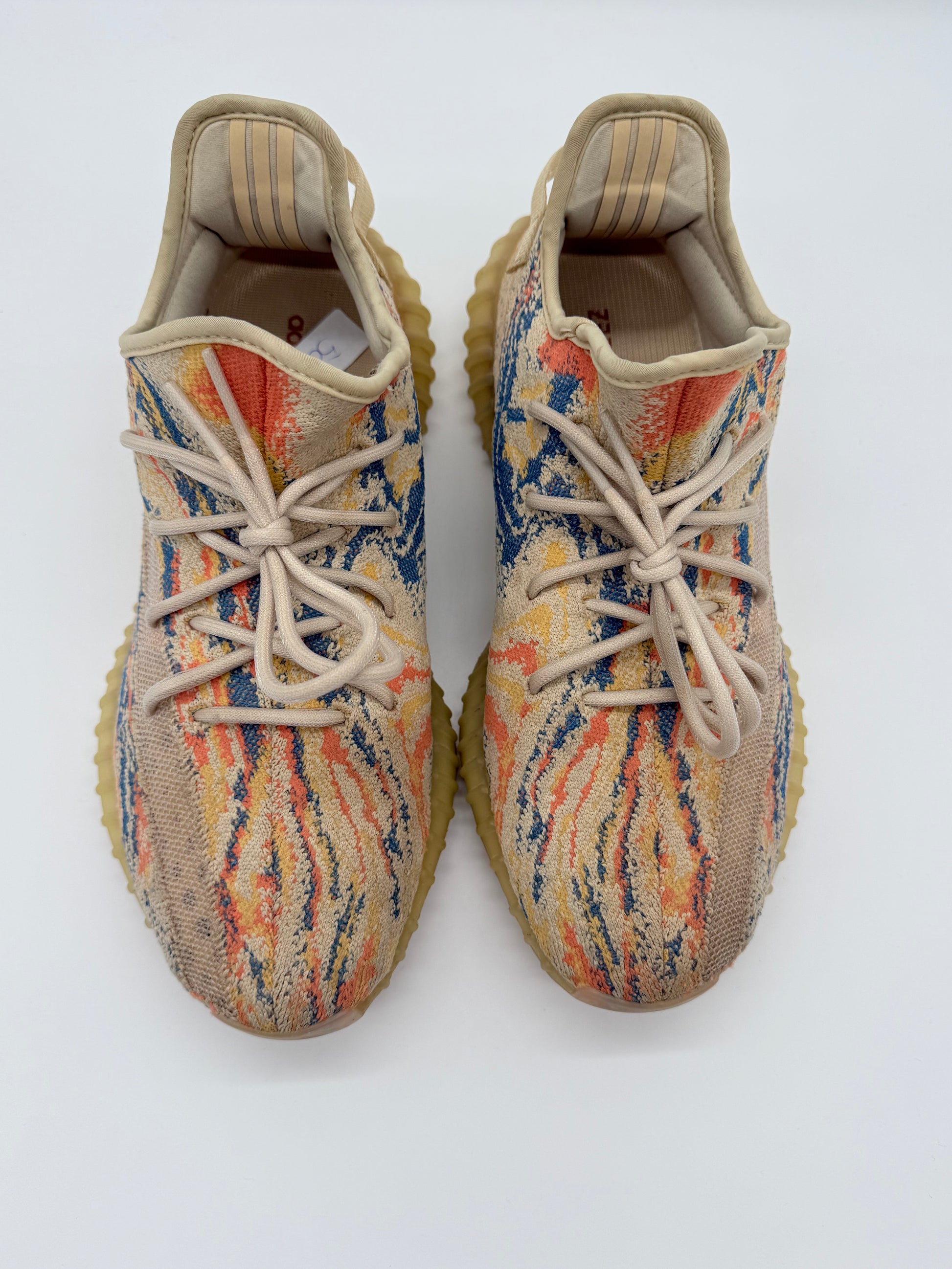 Dit specifieke paar verkeert in heel goede staat. De materialen ogen verzorgd, het Primeknit behoudt zijn structuur en de zool toont lichte, normale gebruikssporen passend bij zorgvuldig dragen. Een sterk exemplaar van een opvallende Yeezy-release.
